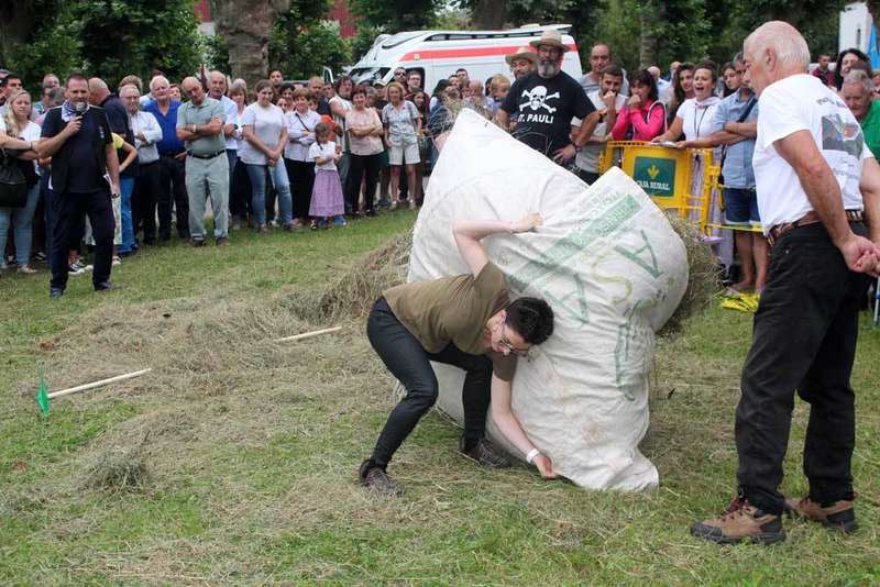 Entre los participantes de este año destacó la presencia de dos mujeres, las dos de fuera de Asturias: Clellan Coe, procedente de Colorado, que se animó a participar en la carrera de madreñes, y Mariló Contreras, llegada desde Almería, que no lo dudó a la hora de inscribirse para probar suerte en el levantamiento de sábanu, una de las pruebas más duras de la jornada en la que destacó por ser de los 4 participantes que fueron capaces de levantar la carga de hierba y caminar con ella.