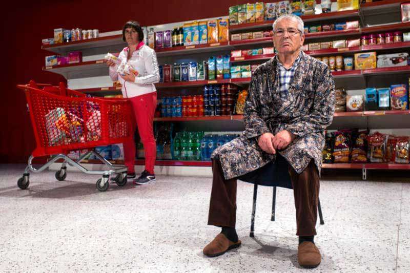 Entre los actores, un abuelo tácito y senil deambulaba con cierta picardía entre los productos, sin acordarse bien de lo perpetrado, como los reyes eméritos. La transición.
