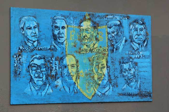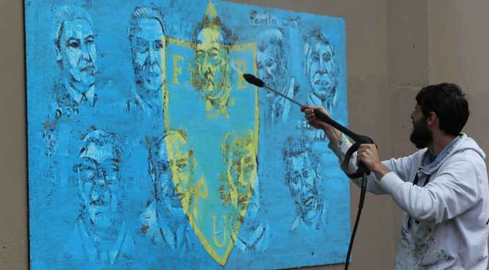 Tras la ofrenda floral en la estatua de La Peruyal, el artista local Dan Miravalles descubrió un mural con los rostros de los que impulsaron esta fiesta.