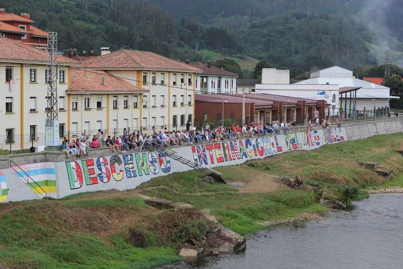 Un centenar de Selleros se juntaron el viernes en el muro sobre el que discurre el Paseo Dionisio de la Huerta, en Arriondas, para inaugurar el mural del 80º Descenso Internacional del Sella, ideado por Agustín Aramburu y que se ha llevado a cabo con la "mano de obra" de todos aquellos voluntarios que quisieron colocar trozos de azulejos para formar la leyenda "80 Descenso Internacional del Sella".