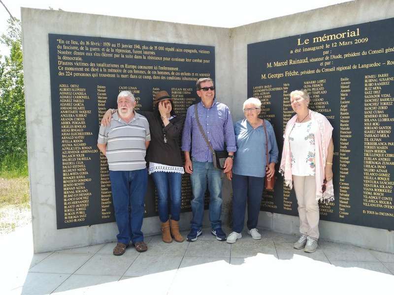 Óscar Blanco Sordía, Sonia Blanco Zarabozo, Félix Blanco Zarabozo, María Luisa Blanco Sordía y Genoveva Blanco Crespo, nietos de Bernardino, junto al monolito en memoria de los fallecidos en el campo de Bram.