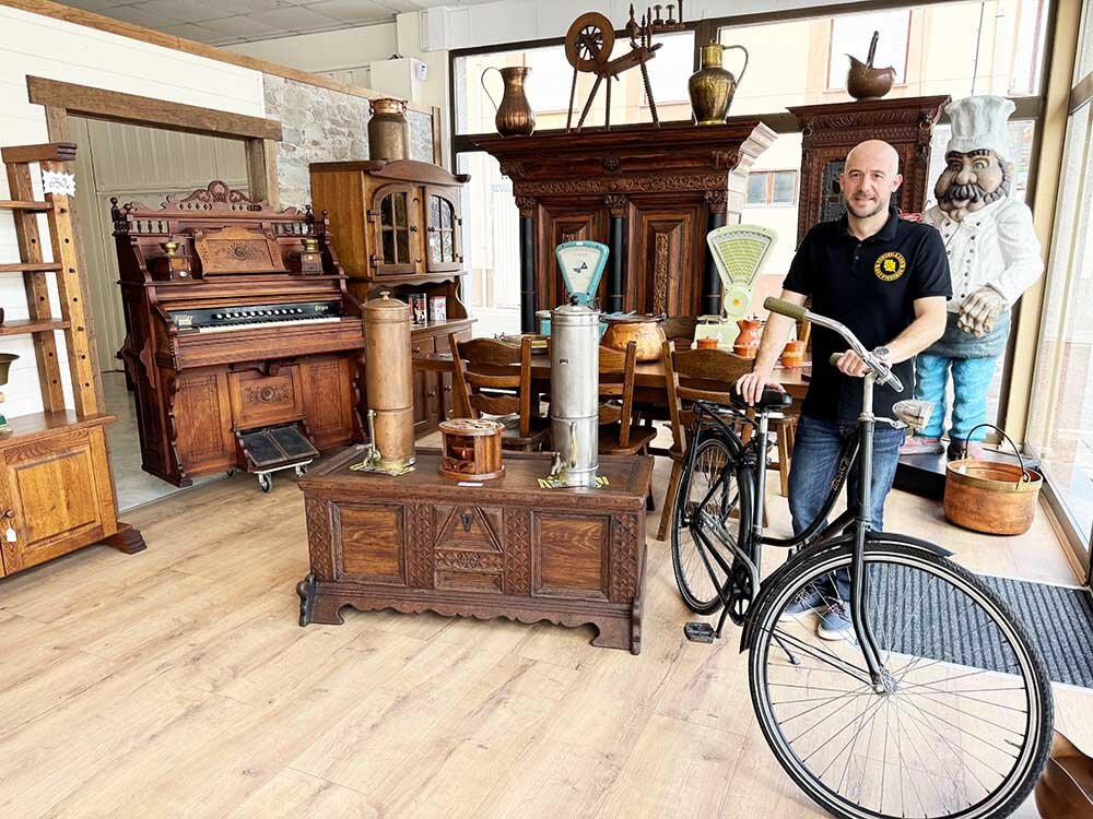 Paúl Gayol, gerente de Romueble y especialista en muebles de roble: nuevos, seminuevos, antigüedades y decoración, nos recibe en Sevares, en la nueva exposición de Romueble.