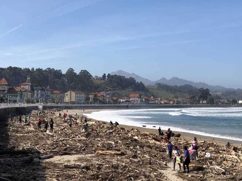 Greenpeace organizó hoy, sábado 16 de marzo, una recogida de plásticos y microplásticos en el arenal de Santa Marina, en Ribadesella, donde se acumulan desde las riadas del mes de enero ingentes cantidades de residuos, a parte de la muchísima madera que sigue allí apilada.