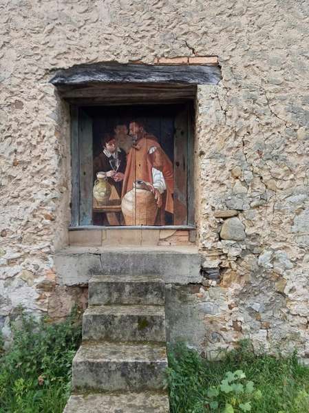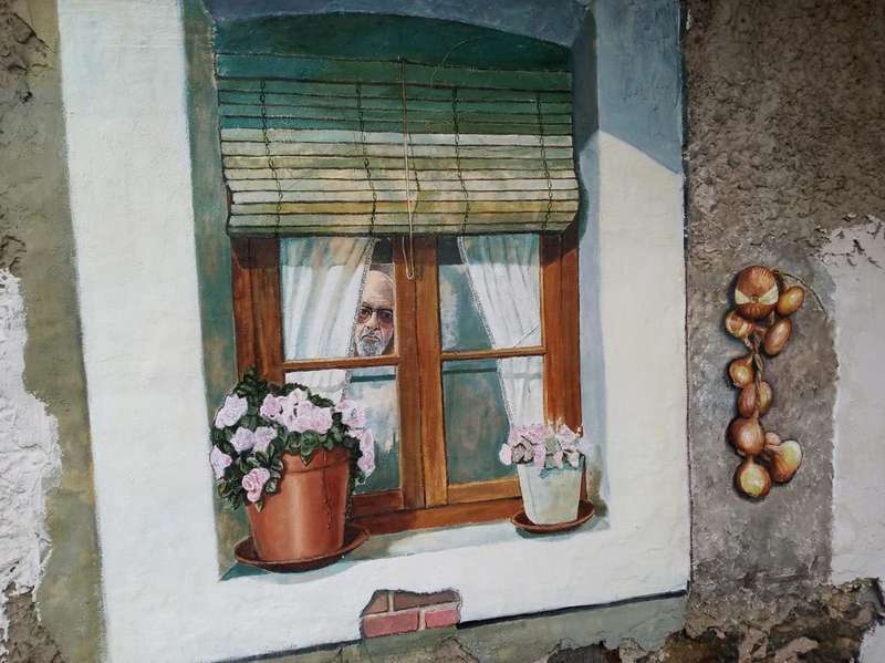 Aunque huya del protagonismo como gato del agua, los dibujos que ha pintado en la fachada de su casa de Vega, en Ribadesella, llaman la atención de los viandantes de esa zona, muy transitada, además, por coincidir con el paso del Camino de Santiago. Su obra callejera la componen varios trampantojos, muy rurales y realistas, que desde lejos consiguen engañar al ojo del observador y hacer creer que -realmente- un caballo y una vaca observan desde la cuadra, o que la calle continúa en un callejón de arcos de medio punto. Un gato, un perro, el Picu Urriellu, una mujer preparando comida y hasta él mismo, el artista, que se asoma tímidamente tras la cortina desde un autorretrato, escondido, como observando a todos los que se paran, curiosos, para admirar su obra.