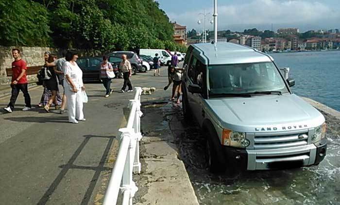 Como ven en la foto, con las olas rompiendo en la defensa, se encontó el propietario del vehículo su Discovery, que había aparcado horas antes en una de las rampas que dan acceso al puerto de Ribadesella.