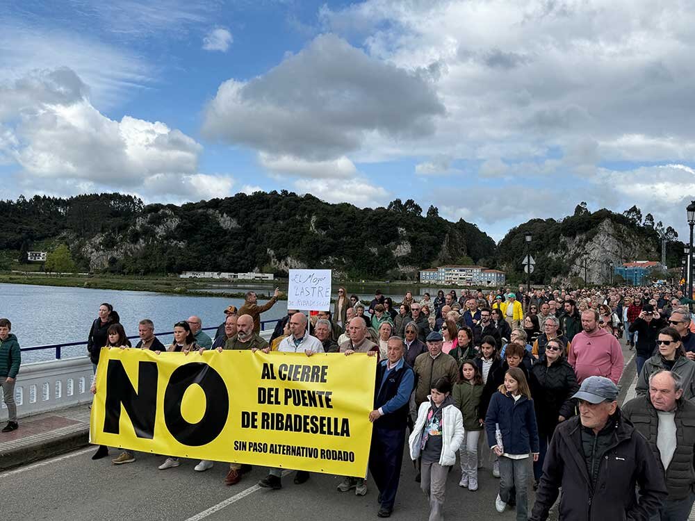 Los riosellanos respondieron masivamente a la convocatoria del gobierno Local, que forman PP y Foro Asturias, para manifestarse hoy, Domingo de Pascua, y pedir al Gobierno de Pedro Sánchez, una alternativa rodada para cruzar la ría, durante las 15 semanas que se prevé estará cortado al tráfico el actual puente de la carretera Nacional 632, mientras se llevan a cabo la obras previstas para su remozado. En la cabecera de la marcha, sosteniendo la pancarta en la que se leía "No al cierre del puente de Ribadesella, sin paso alternativo rodado" iba también el único concejal de Vox en el Ayuntamiento riosellano, Juan José Merino.