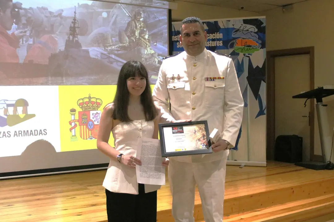Candela Espinar, alumna de segundo de bachiller del IES Astures de Lugones, recibió de manos del subteniente de la armada, Juan Carballo, el diploma acreditativo por el que su trabajo Volar sin alas se hacía con el primer premio del concurso Carta a un militar español, una iniciativa de la Dirección General de Reclutamiento y Enseñanza Militar participaron 11 colegios e institutos de Asturias. Con su trabajo, Candela pasó a la final, junto a los ganadores de los otros institutos asturianos, de la que salió la representante de nuestra región para competir a nivel nacional, que, tras votación del jurado, será Candela Pérez Álvarez, alumna del colegio Sagrada Familia El Pilar, de Pola de Lena.