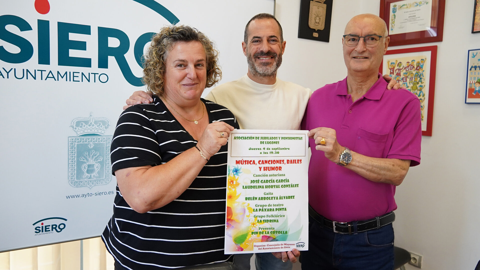 El alcalde de Siero, Ángel García; la concejala de Mayores y Patrimonio, Pilar Santianes; y el presidente de la Asociación de Jubilados y Pensionistas de Lugones, José Manuel Suárez, presentaron la gala cultural que tendrá lugar hoy, 4 de septiembre, en el Hogar del Jubilado de Lugones.