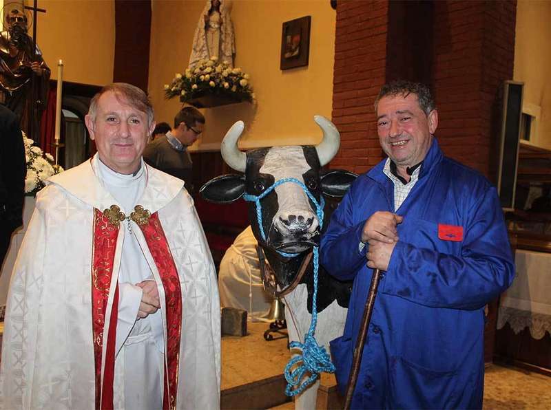 La nota divertida de la celebración la puso el lugonés -y amigo del sacerdote-, Alejandro Bobes, quien participó con una réplica de una vaca frisona. «Le dije -días antes le llamó por teléfono- que iba a llegar hasta el altar por San Antón y aquí estoy», señaló riéndose.