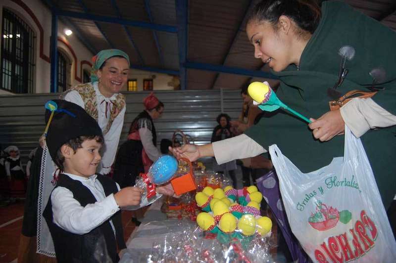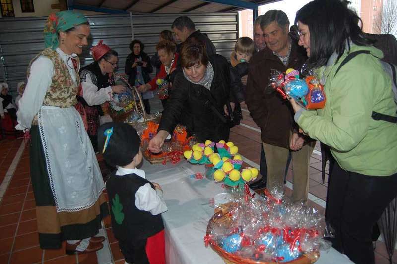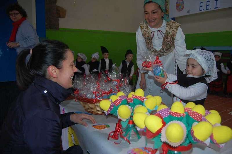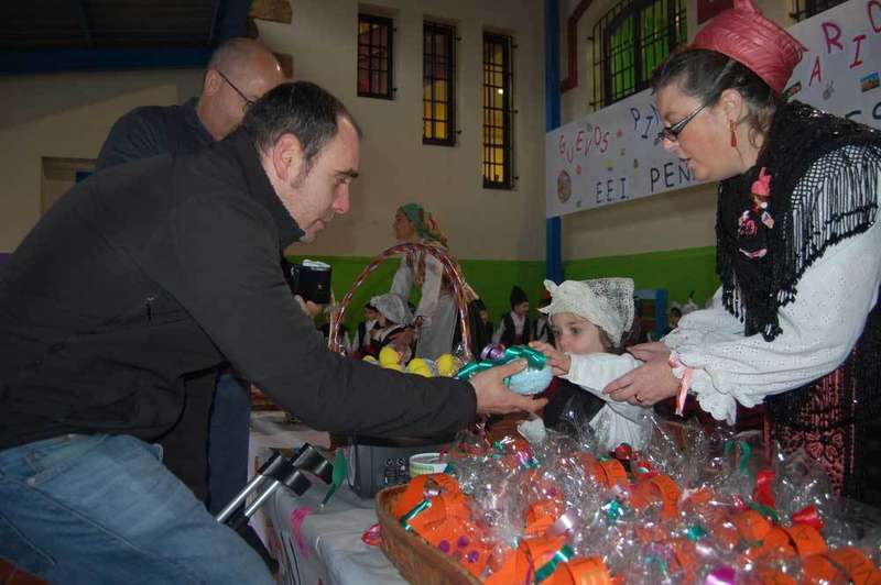 Los alumnos del Colegio Infantil Peña Careses de Pola de Siero adelantaron una semana la celebración de los Güevos Pintos. Ataviados con trajes regionales, los pequeños pusieron hoy martes a la venta los huevos que ellos se encargaron de pintar en clase, conociendo, de esta manera, la tradición de la fiesta más colorista de la capital del concejo.