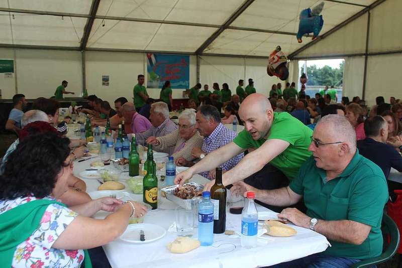 La mesa ya estaba puesta para las dos y media de la tarde pero no fue hasta las tres cuando comenzaron a servir. Un orquestado equipo de camareros-componentes de la comisión-atendieron a los comensales que, un año más, degustaron este asado.