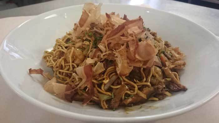Yakisoba (salteado de verduras, ternera, langostinos, tallarines, salsa Tonkatsu y Katsuobushi.