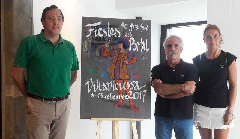 El alcalde de Villaviciosa, Alejandro Vega Riego, acompañado de la concejal de Festejos, Ana López Montes, y del pintor José Cuadra presentaba la pasada semana el cartel de les Fiestes del Portal 2017.