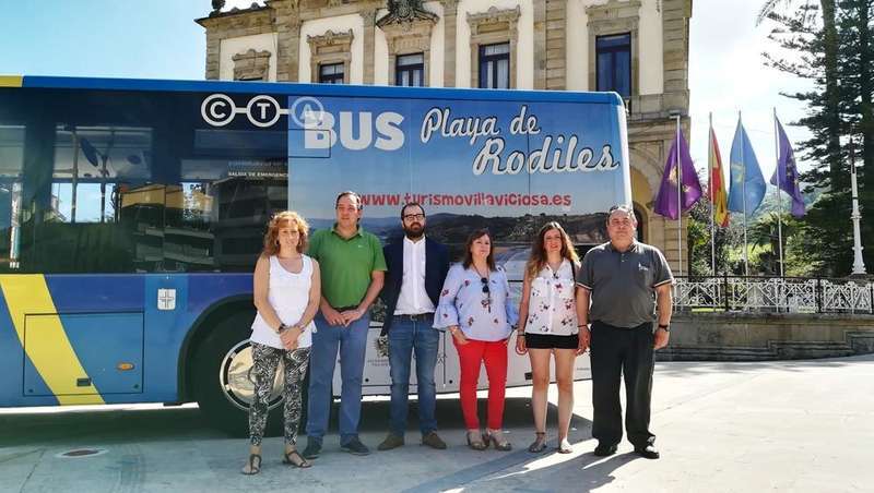 El pasado viernes, en la plaza del Ayuntamiento de Villaviciosa, se presentó el servicio de bus lanzadera a la playa de Rodiles desde la capital del concejo maliayo, una facilidad para acceder a la playa que tiene como objetivos promover el uso del transporte público en detrimento del vehículo privado para, de este modo, cuidar del medio ambiente y ahorrar tiempos de aparcamiento en una de las playas más concurridas de Asturias. Además, el bus servirá para hacer promoción turística de Villaviciosa y, con ese fin, el vehículo está vinilado con imágenes del concejo y su web turística, así como con la campaña de promoción del comercio local.